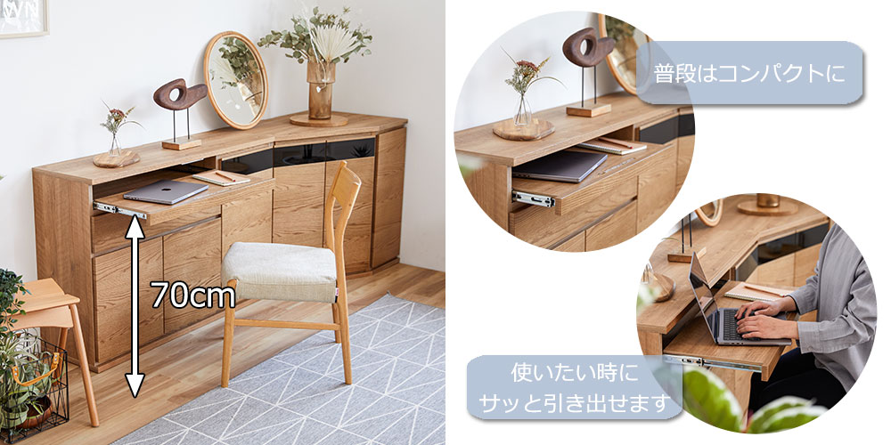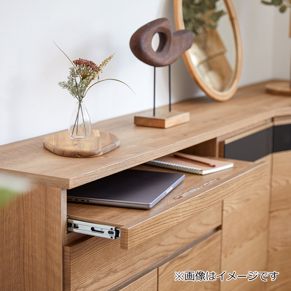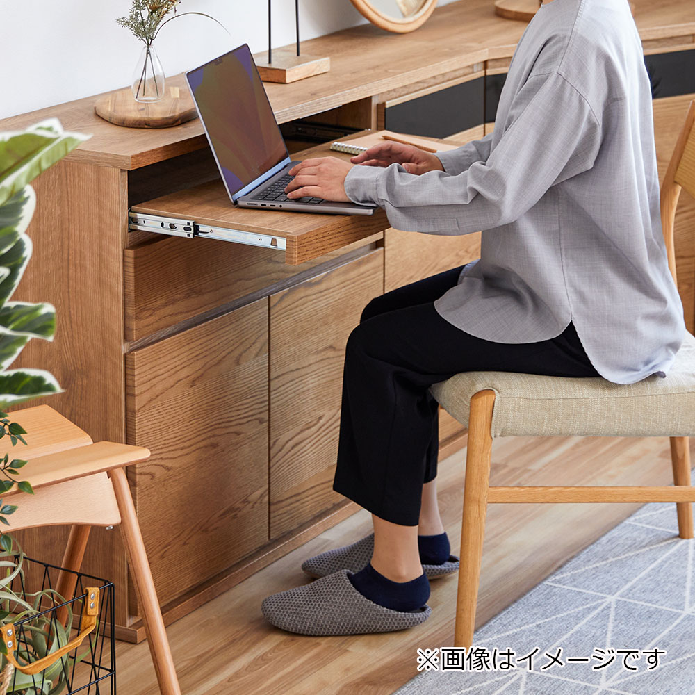サイドボードには高さ70cmのスライド式カウンターを設けています。デスクワークや作業台など、さまざまな使い方ができます。※画像はOK-VN色のイメージです。