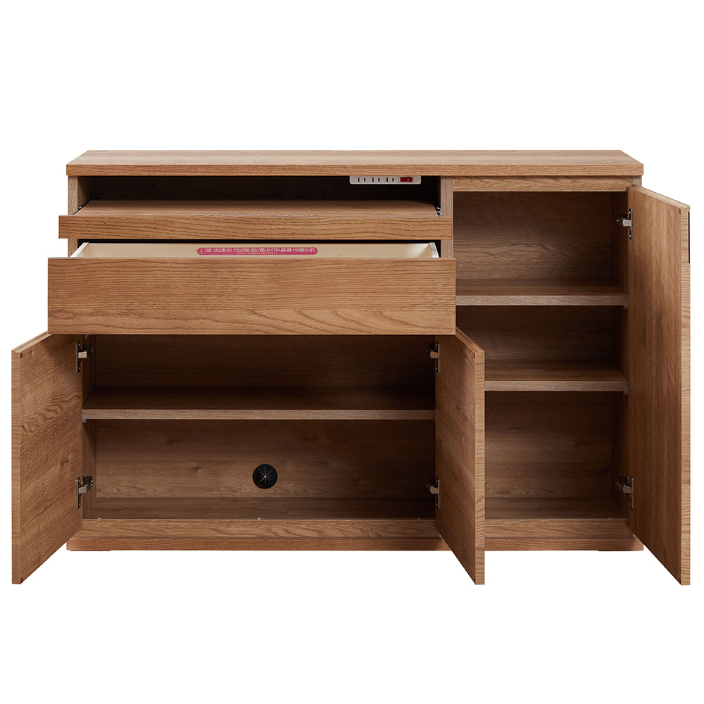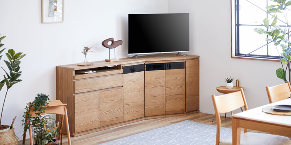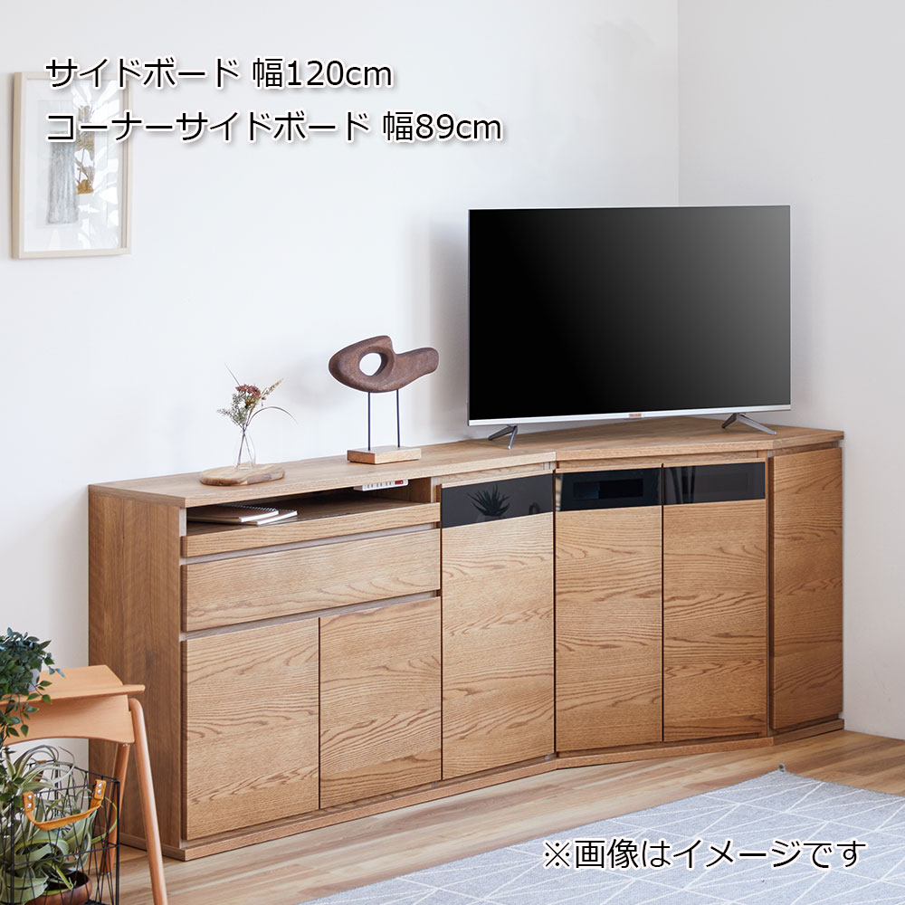 別売りのコーナーサイドボードと合わせていただくと、お部屋の隅に綺麗に設置することができます。ハイタイプテレビ台として、ダイニングからでも見やすい位置にテレビが設置することも可能です。※画像は「サイドボード 幅120cm」と「コーナーサイドボード 幅89cm」/OK-VN色のイメージです。※コーナーサイドボードは別売りです。