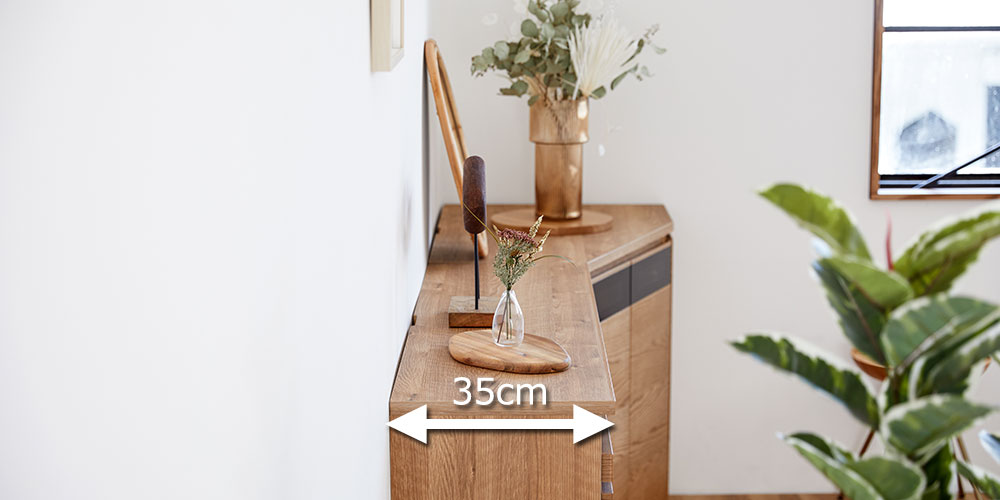省スペースで機能的なサイドボードです。奥行35cmとスリムな設計なので、場所を取らずに設置できます。天然木の質感をお愉しみいただける、シンプルなデザインが魅力です。※画像はオークヴィンテージナチュラル色(以下「OK-VN色」と表記)のイメージです。