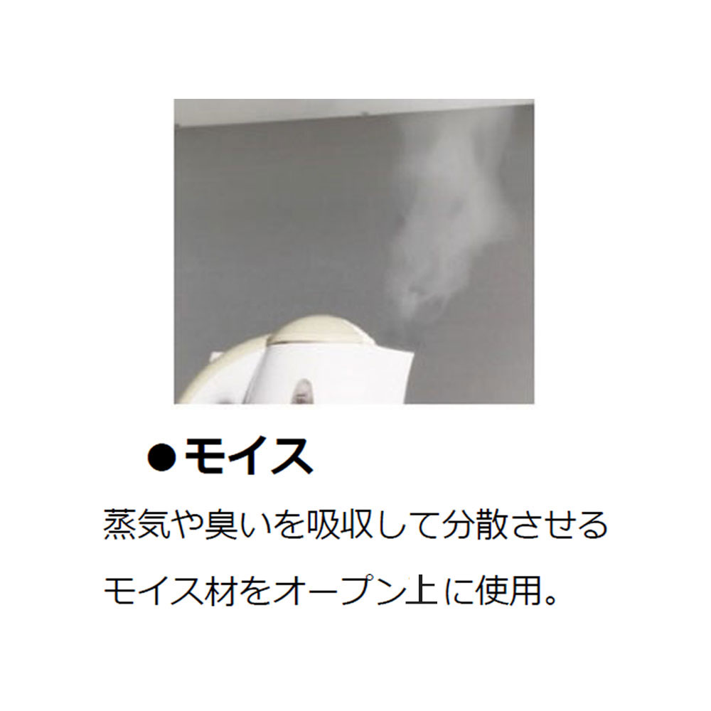 ●モイス:蒸気や臭いを吸収して分散させるモイス材を上台オープン部分の上部と、下台家電収納部分の上部に使用。