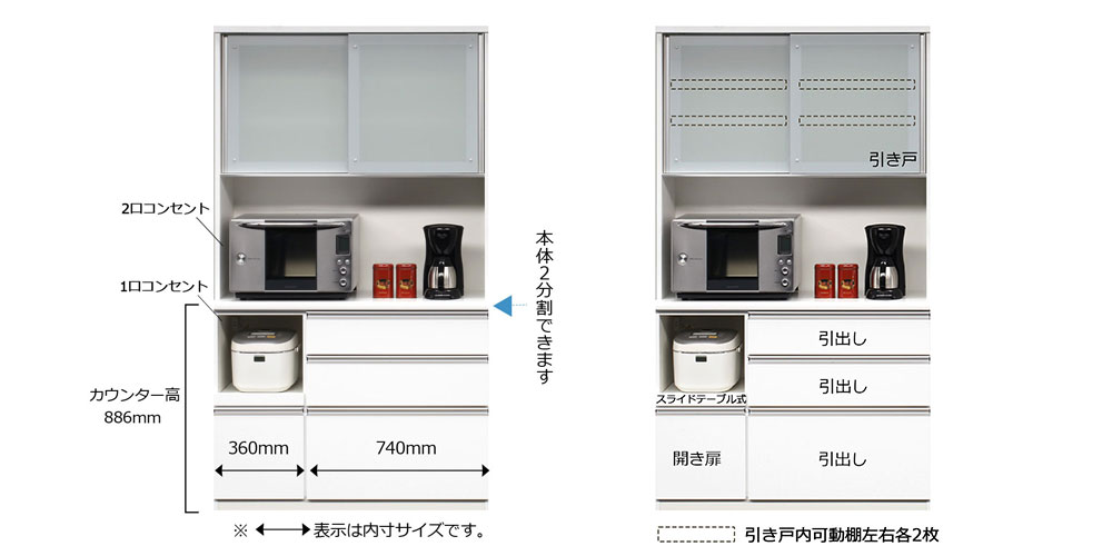 引き戸内には可動棚が左右各2枚あります。カウンター下にはスライドテーブル式の家電収納スペース付きです。※蒸気が発生する家電はスライドをすべて引き出した状態でご使用ください。