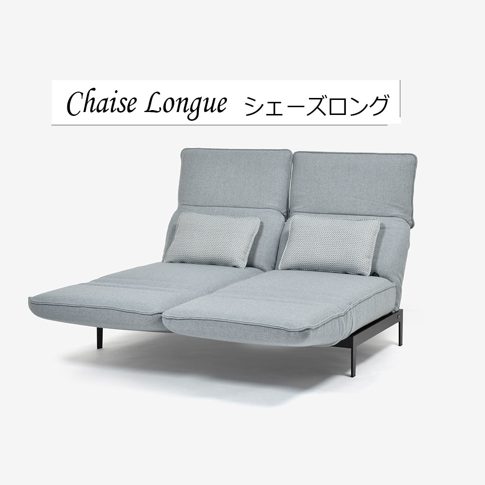2シートとも回転させ、肘と背クッションを伸ばせはシェーズロングスタイルに。一人分の横幅が750mmもあるので、それぞれ気ままにくつろげます。