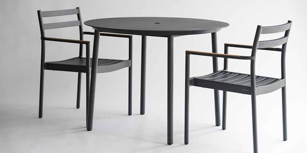 6mm厚のアルミ天板を使用した、中央に日傘を設置できる円形タイプのテーブルです。 KAISのチェアとアームチェアを共にご使用いただけます。
