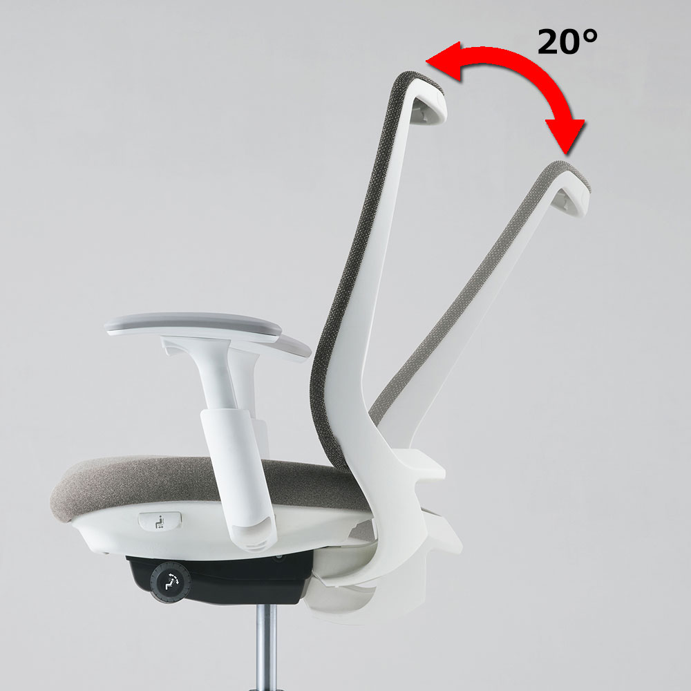 座左下にあるリクライニング固定/解除レバーを傾けることで調整ができます。背に寄りかかり、傾いた位置でレバーを一回傾けると背は固定されます。もう一回傾けると解除され、フリーな状態に戻ります。(5段階固定、リクライニング角度20°)