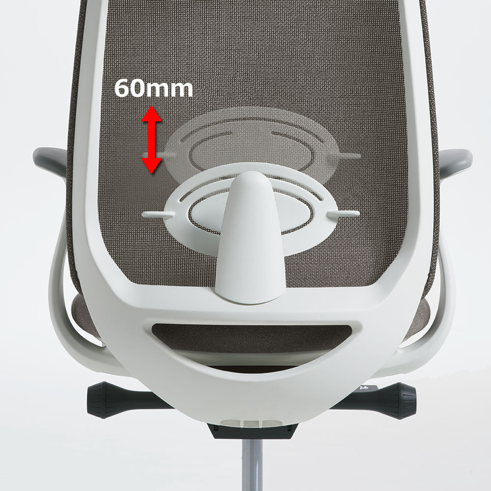 腰を支えるランバーサポートが付いています。左右のツマミをつかんで上下に動かします。上下60mmの調整が可能です。※画像はイメージです。