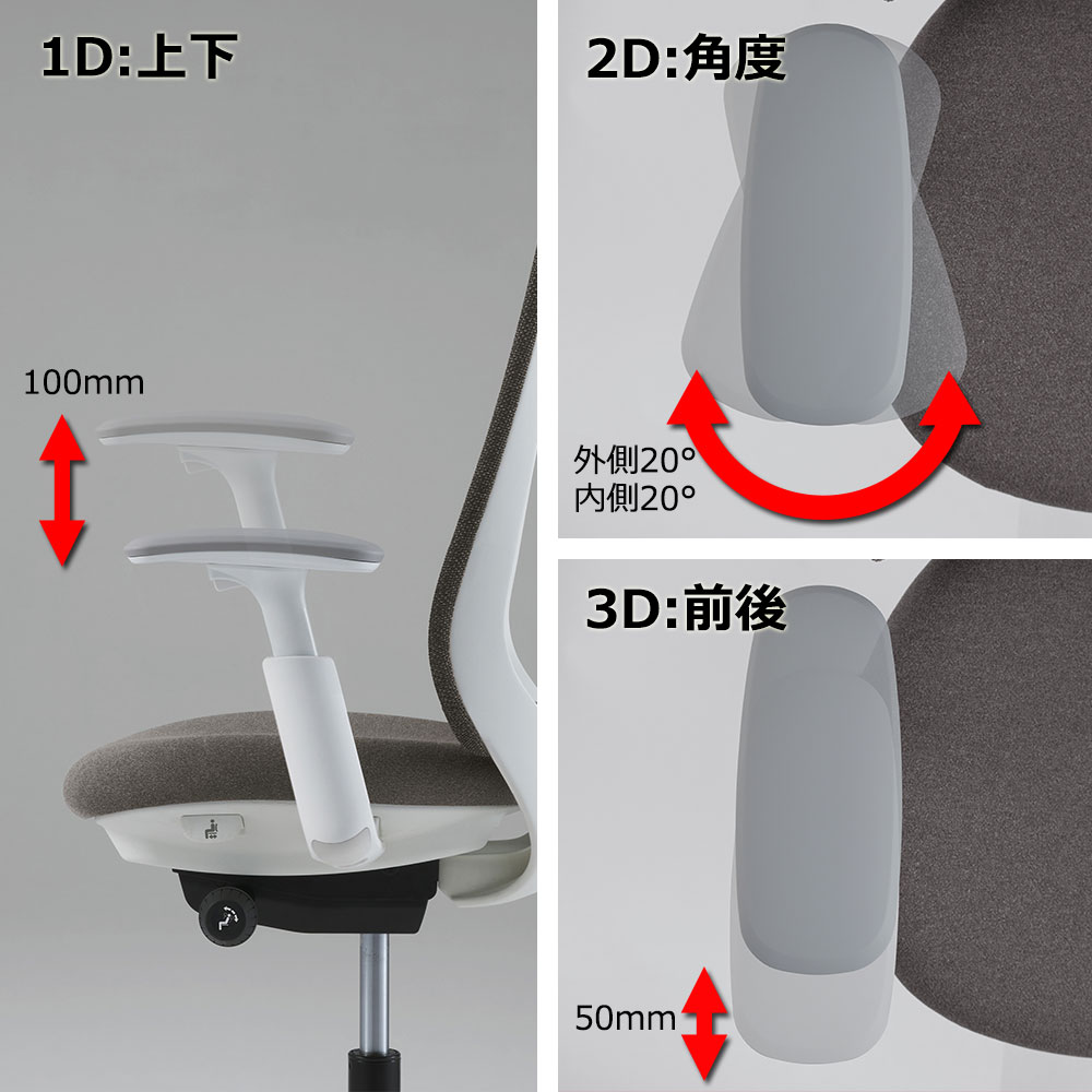 「3Dアーム」は体格や姿勢の変化に合わせて、細かく調節ができます。肘パッド裏にあるボタンを押すことで、高さ調節100mm。また、前後調整は50mm、角度調整は内外に20°ずつできます。※画像はイメージです。※画像はイメージです。