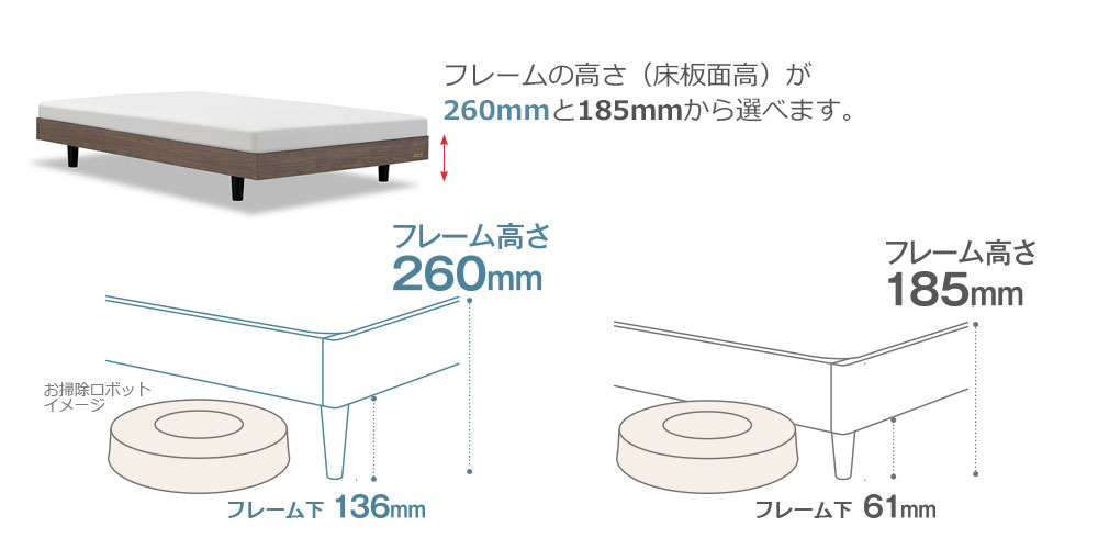 マットレスの厚みやロボット掃除機のご使用など、ベッドルームの環境に合わせてフレーム高さ(床板面高)を260mmと185mmから選べる2段レッグ仕様で、お好みに応じて調節できます。※配送組立時にご希望の高さをご指定ください。高さ260mmの場合、フレーム下の高さが136mmあり、お掃除ロボットにも対応できます。※お使いの機種・仕様をご確認下さい。