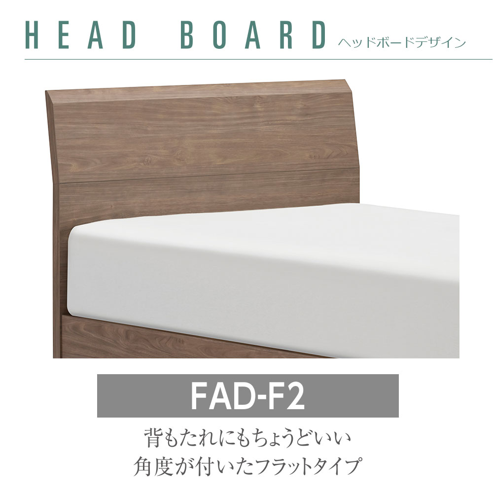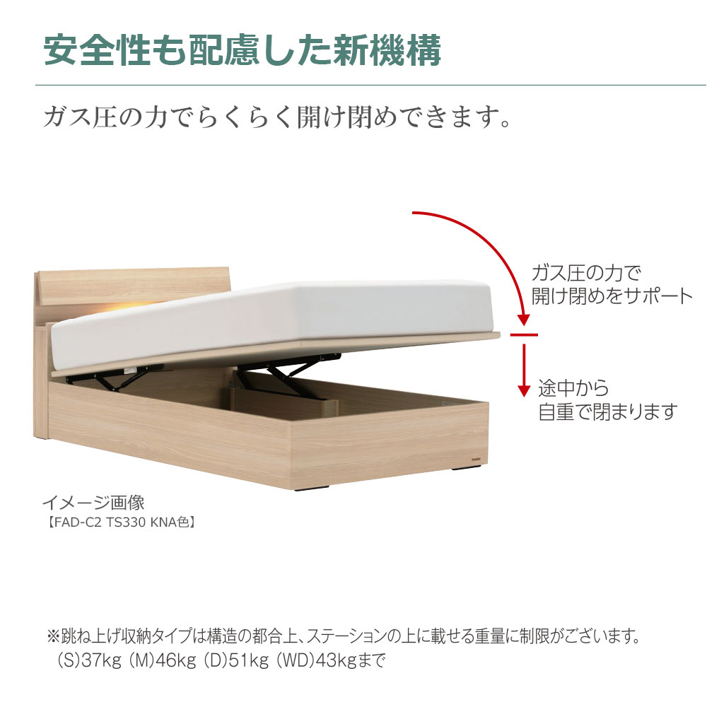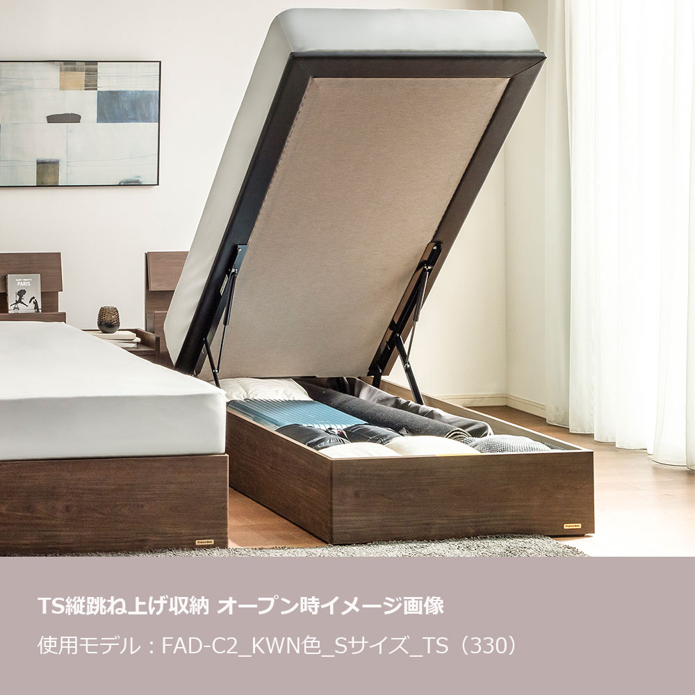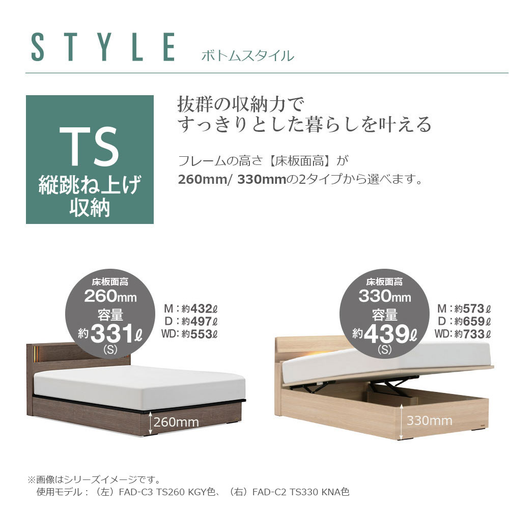 「FAD-F2 TS」は、背もたれとしてくつろぐのにちょうど良い角度のゆるやかな傾斜のついたヘッドボードで、テレビ視聴や読書など眠る前のひと時も快適に過ごせます。大容量の収納スペースが魅力の縦型の跳ね上げ式収納ベッドフレームで、長い物や大型のものもたっぷり収納できます。収納量に応じて床板面高260/330mmの2タイプから選べます。