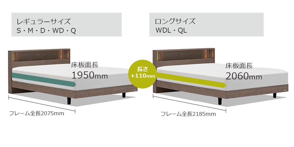 ワイドダブル(幅1540)とクイーン(幅1710)については、レギュラーサイズより110mm長いワイドダブルロング、クイーンロングサイズもお選びいただけます。