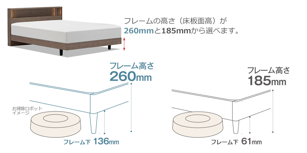 マットレスの厚みやロボット掃除機のご使用など、ベッドルームの環境に合わせてフレームの高さ(床板面高)を260mmと185mmから選べる2段レッグ仕様で、お好みに応じて調節できます。※配送組立時にご希望の高さをご指定ください。高さ260mmの場合、フレーム下が136mmあり、お掃除ロボットにも対応できます。※お使いの機種・仕様をご確認下さい。