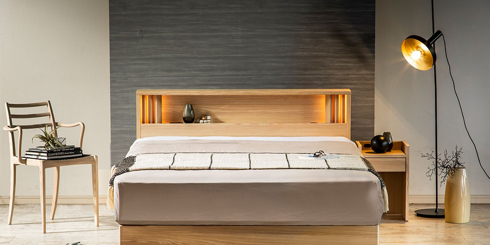 やすらぎを感じられる木目調でくつろぎの寝室を演出し、ヘッドボード左右のスリットからもれる光が様々な表情をみせてくれます。※画像はイメージです。使用モデル:FAD-C3 DR260 Dサイズ KNA色