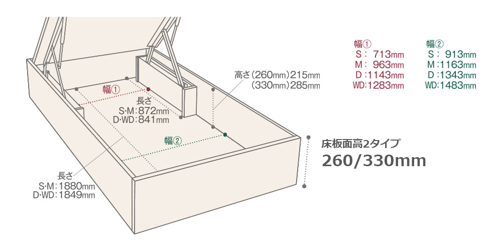 【全サイズ共通】床板面高260mm/330mmの2タイプから選べます。