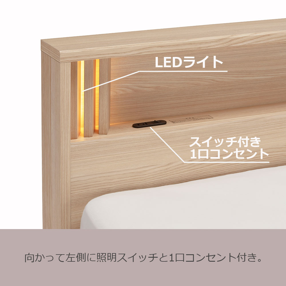 左右のスリットの間から枕元をほのかに照らすLEDライトと、向かって左側にはスマートフォンの充電にも便利なコンセント付きです。