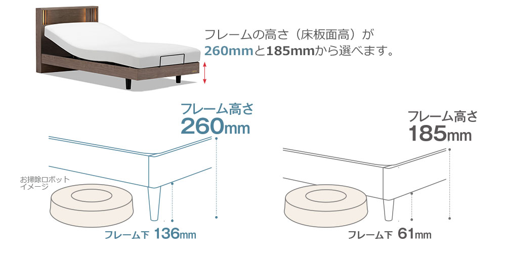 マットレスの厚みやロボット掃除機のご使用など、ベッドルームの環境に合わせて床板面高を260mmと185mmから選べる2段レッグ仕様で、お好みに応じて調節できます。※配送組立時にご希望の高さをご指定ください。高さ260mmの場合、フレーム下が136mmあり、お掃除ロボットにも対応できます。※お使いの機種・仕様をご確認下さい。