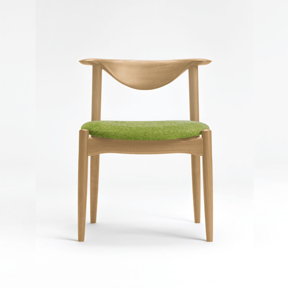手で触れた時の感触がやさしい気持ちになり、毎日でも触れていたいと思わせるようなダイニングチェアです。この感触やふんわりとした見た目の背もたれの立体感は、無垢材を削り出すことで生み出されます。画像の張地は#213 グラスです。