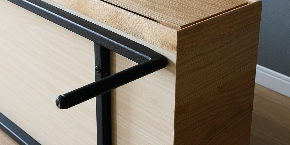 人気の天然木と金属フレームの組合せがスタイリッシュな印象のテレビボード「ノース」。細身の脚にすることでよりすっきりとした見た目に仕上がっています。フラップ扉にはスリット穴がありますので、扉を閉めたままでもリモコン操作が可能です。※機器の受信部の位置によってはリモコンが効きにくい場合がありますので、予めご了承ください。
