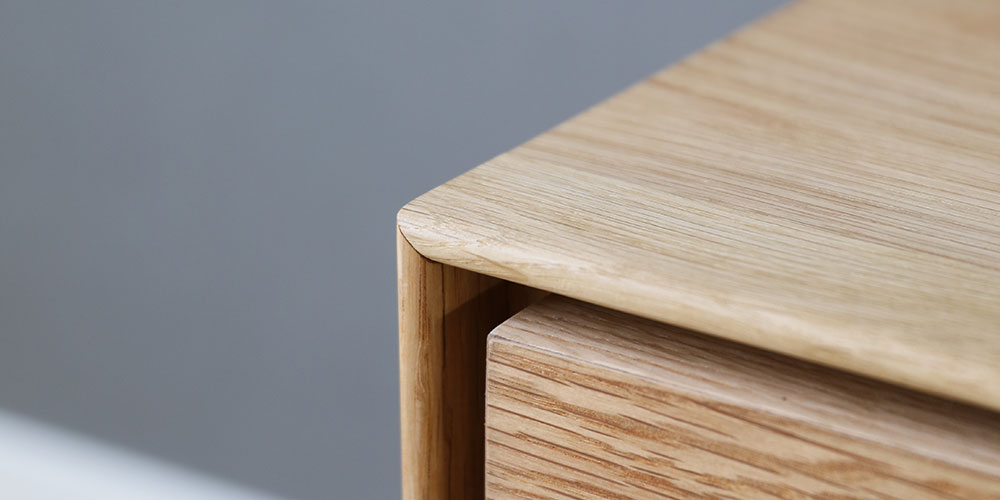 天板と側板の接合は互いの小口を斜め45°にカットすることでコーナー部分に厚みが出ず、すっきりとした印象に仕上がります。※画像はオーク材LBR色です。