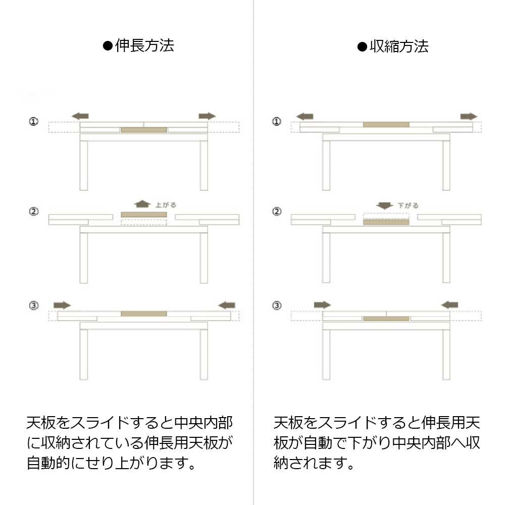 ・伸長方法 【1】左右どちらかの天板を外側にスライドする【2】中央内部から伸長天板が自動でせり上がる【3】天板を内側に押しもどし完了