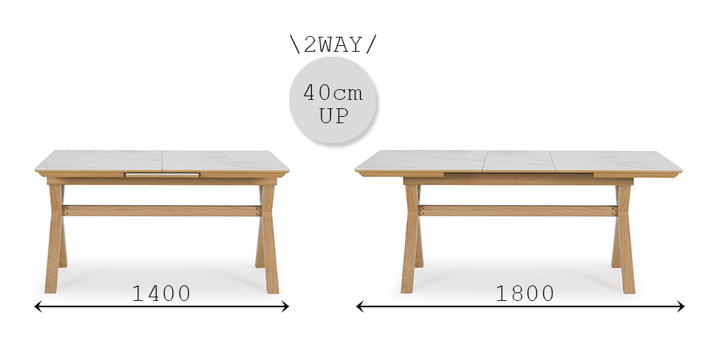 天板が幅140cmから180cmに伸長するので、普段は140cm、来客時や作業をする時、料理の品数が多い時には180cmに広げて使うなど用途に合わせてお使いいただける便利な2WAY仕様です。