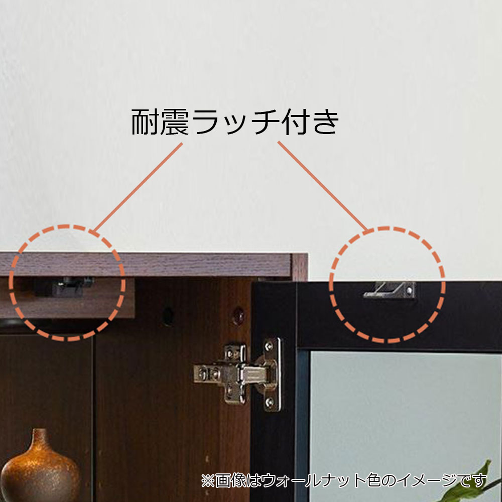 地震などで揺れを感知した際に、扉が開かないようになっています。万が一の時でも安心してご使用いただけます。※キャビネット下扉には付いていません。※画像はウォールナット色のイメージです。