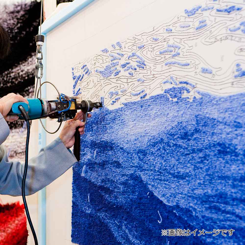 躍動する海の表情を濃青のグラデーションとぼかし技法で表現したじゅうたんです。平面のラグに波を立体的に描き、まるで写実的な絵画のような美しいデザインが、お部屋の雰囲気を一層引き立ててくれます。