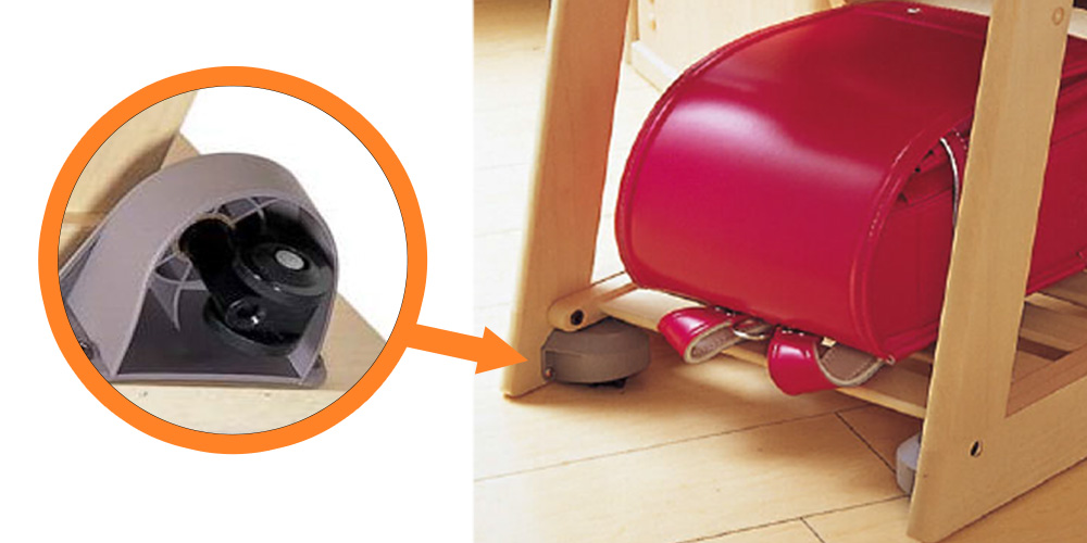 キャスターは360度動き、お子様の力でも移動がスムーズです。椅子に座った際は、動かないように固定される安全設計です。足元にはランドセルなどの荷物が置けるすのこトレーを設けています。