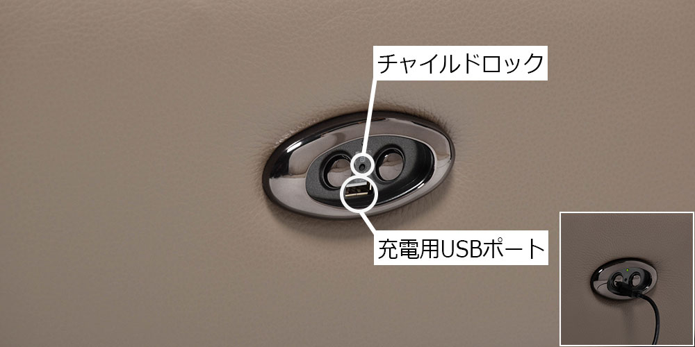 側面にあるリクライニング用のスイッチにはチャイルドロックやUSBポートが付きます。くつろぎながらもスマートフォンやタブレットの充電も可能です。