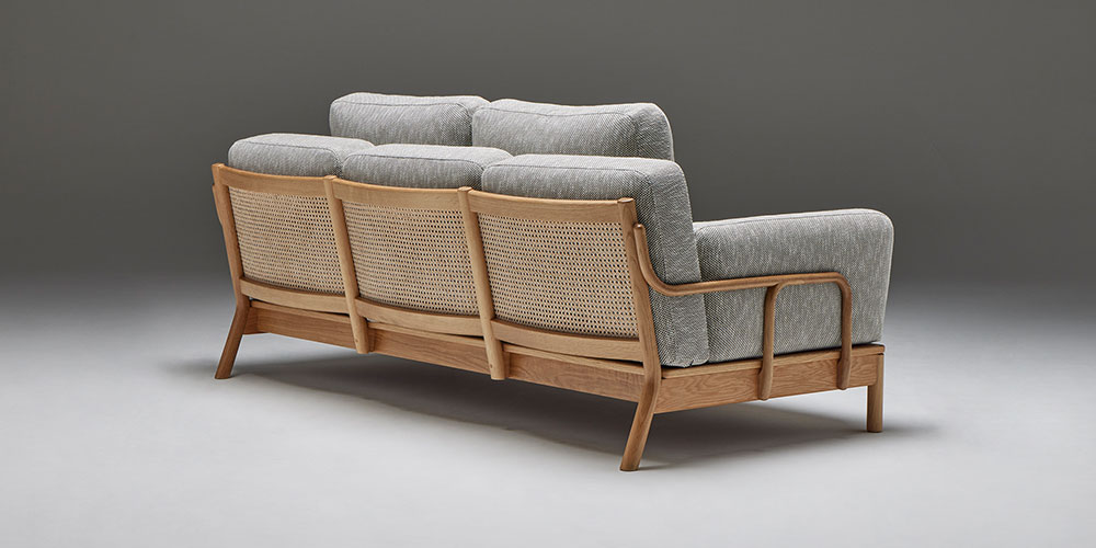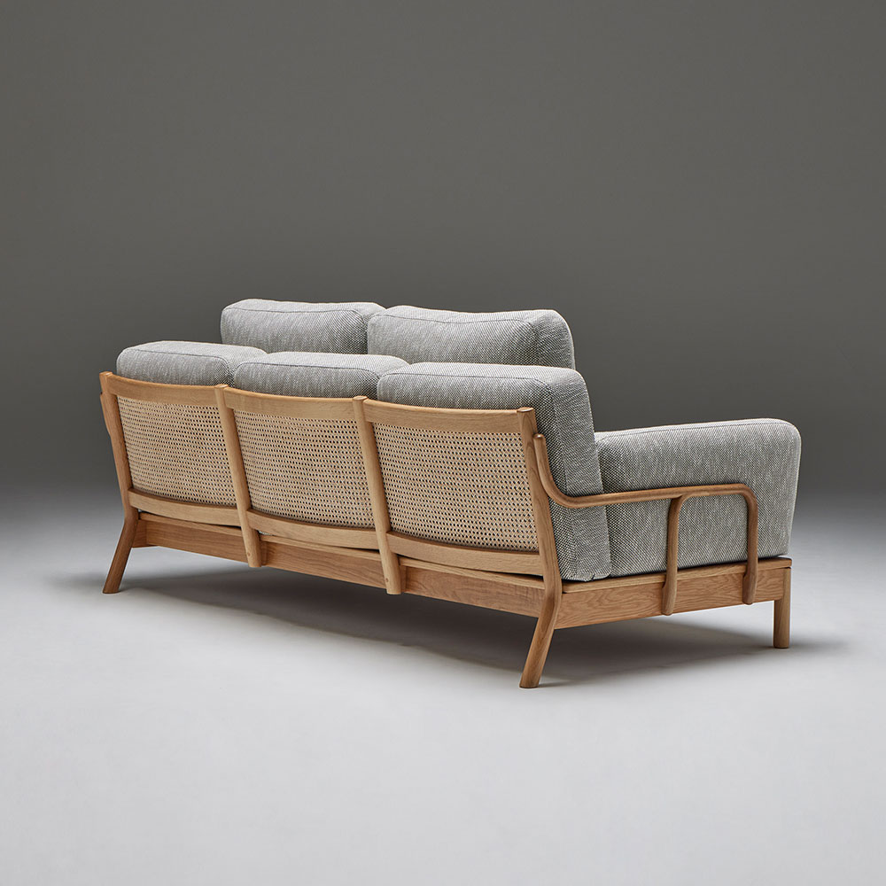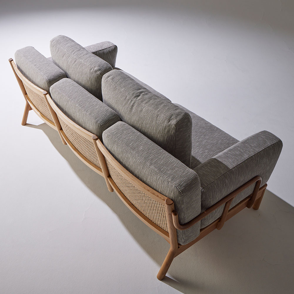 籐の背もたれと、肘掛けのクッションを支える曲げ木のパーツが、ソファ全体の雰囲気と絶妙なバランスを保ちながら、クラシックな趣を作り出しています。