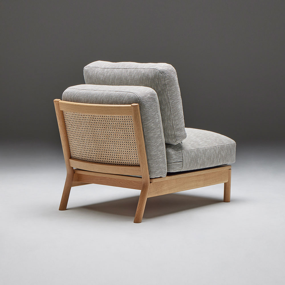 優しい印象のナラ材フレームに、背もたれは籐張りになっており、全体の雰囲気と絶妙なバランスを保ちながら、クラシックな趣を作り出しています。
