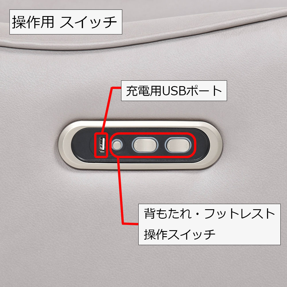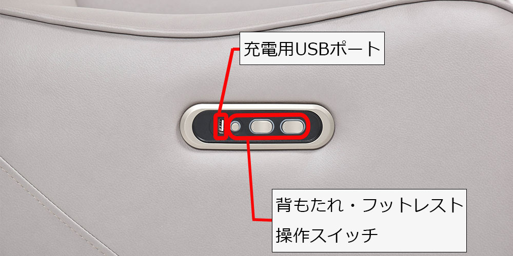 本体側面に操作用スイッチがあります。スイッチ部分には充電用のUSBポートも付属しています。
