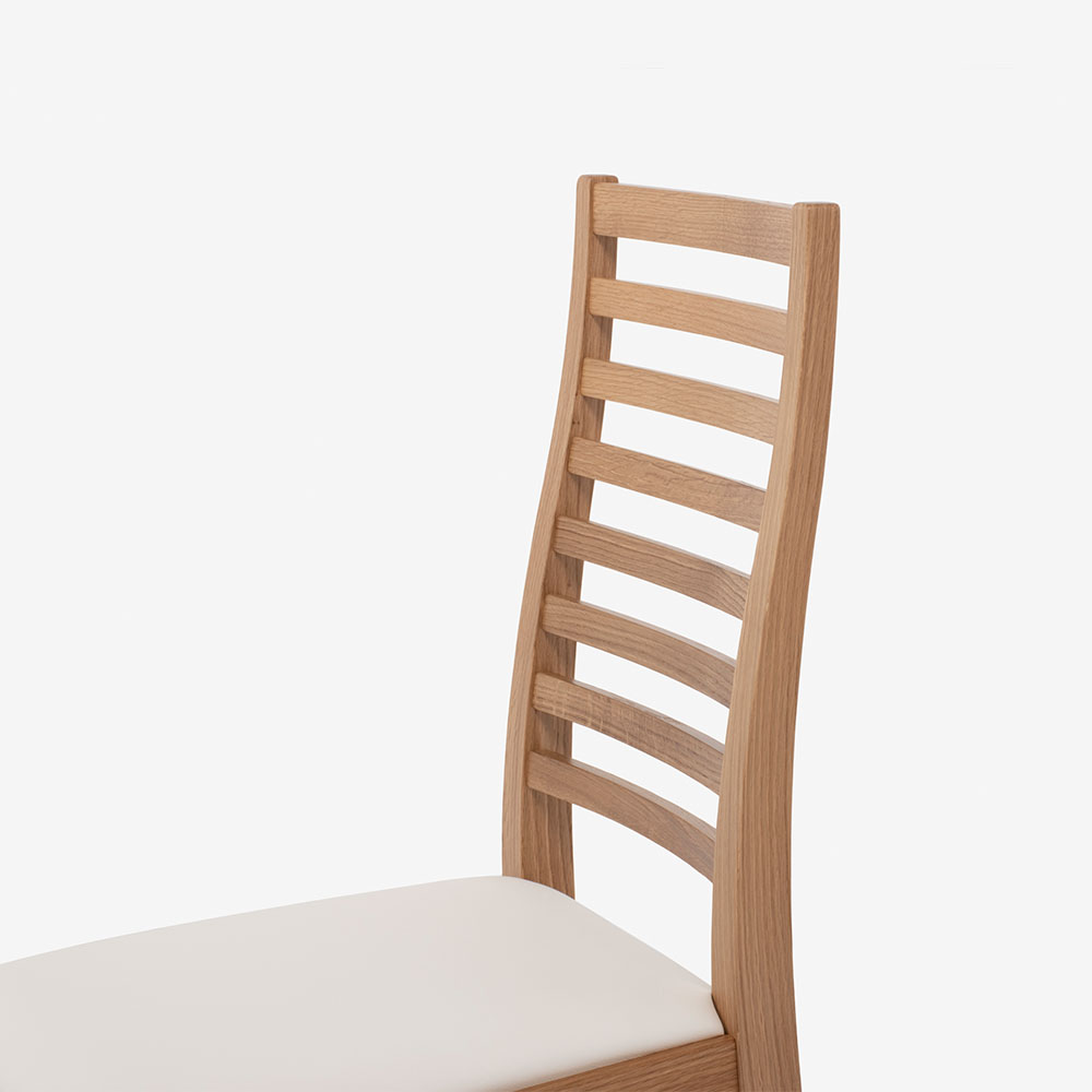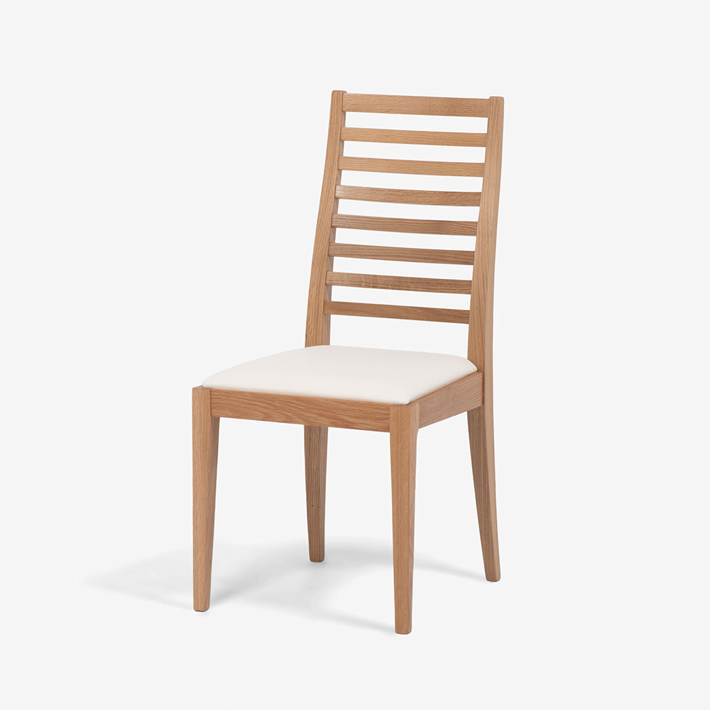 背中にフィットし、やさしく身体を支えてくれる背もたれのデザインが魅力のダイニングチェアです。フレームにはあたたかみのある風合いが印象的なナラ材を使用しており、上品な佇まいです。