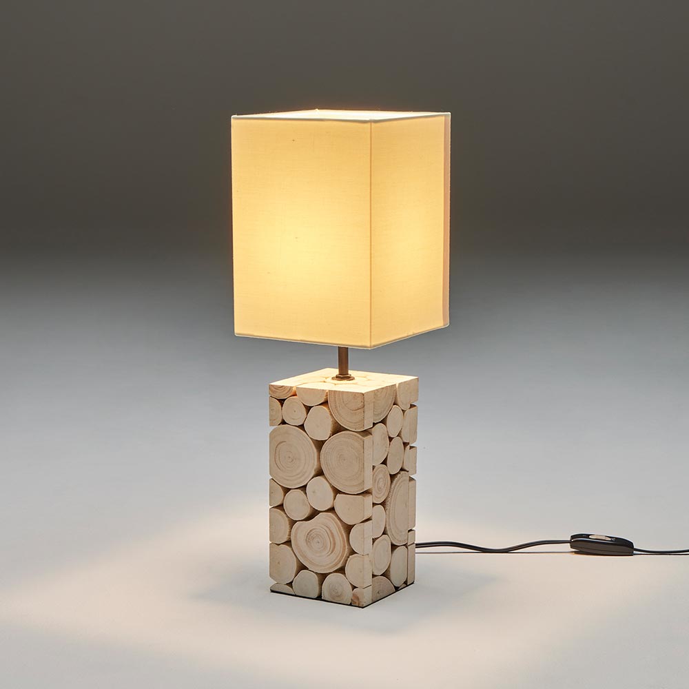 柔らかく光を拡散するファブリックセードや、形状の異なるユーカリ材を巧みに組み合わせたボディは、職人の繊細な技術がうかがえるディテールです。