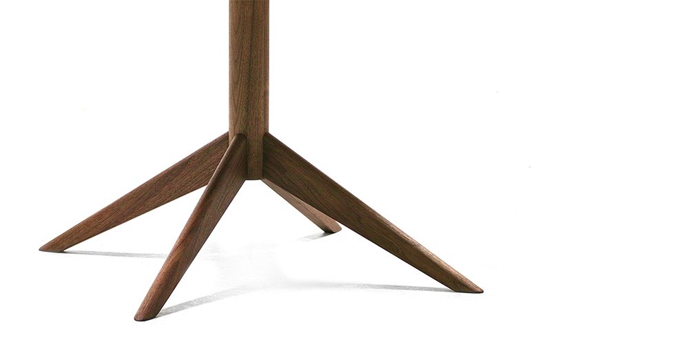 4本のシャープな部材が1本の無垢材の脚を持ち上げているようなデザインが、お部屋に軽快さをプラスしてくれます。1本脚のラウンドテーブルはスペースを有効活用でき、複数人でテーブルを囲んでも足元に窮屈さがなくご使用いただけます。