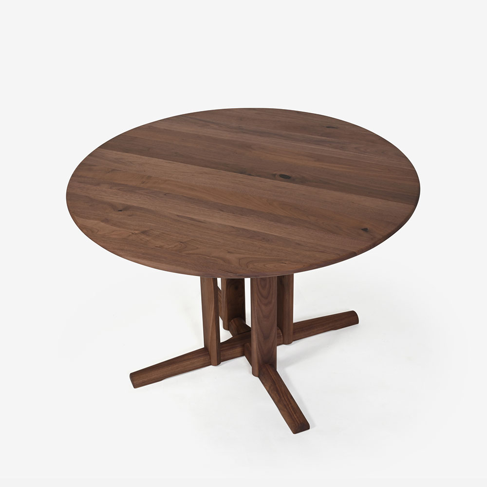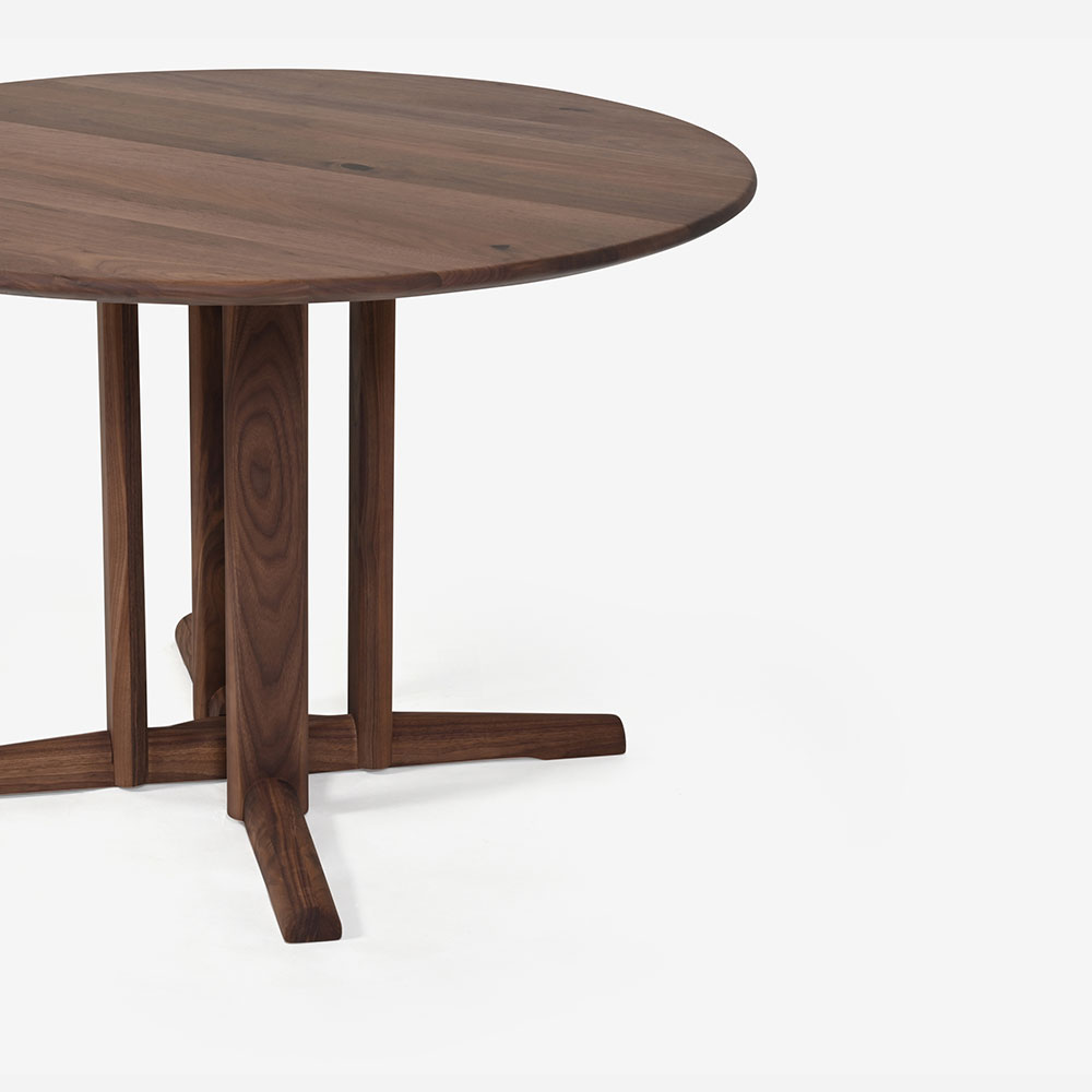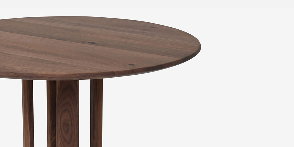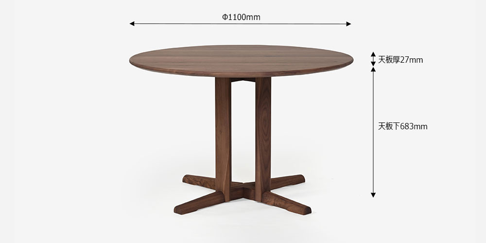 コンパクトな直径110cmの円形テーブルは、大人4人でもゆったりと囲めるサイズ。 1本脚タイプは自由に椅子をレイアウトすることができます。天板の厚みや脚部のディテールにこだわって、すっきりと仕立てました。