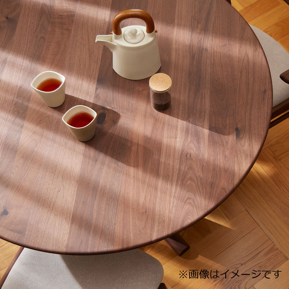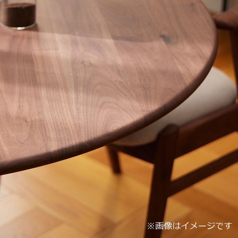 円形のダイニングテーブルとシリーズ商品のダイニングチェアを組み合わせたコンパクトなダイニングコーディネートです。ウォールナット材の落ち着いた木目で統一することで、大人でシックなダイニングコーディネートとなっています。※画像は天板小口テーパー(T)・ウォールナット材(FWC)のイメージです。