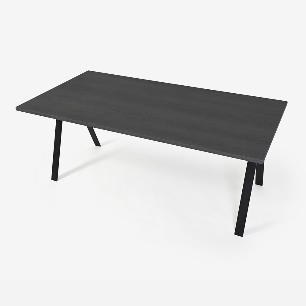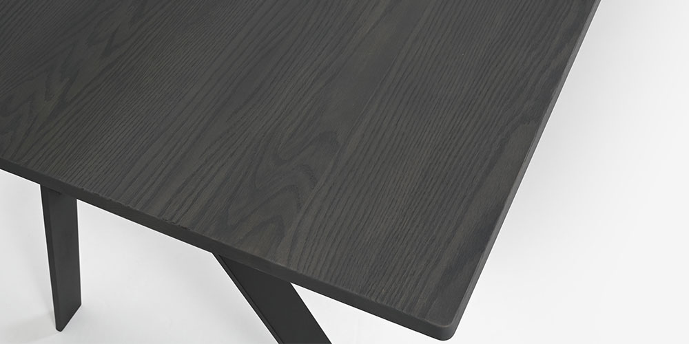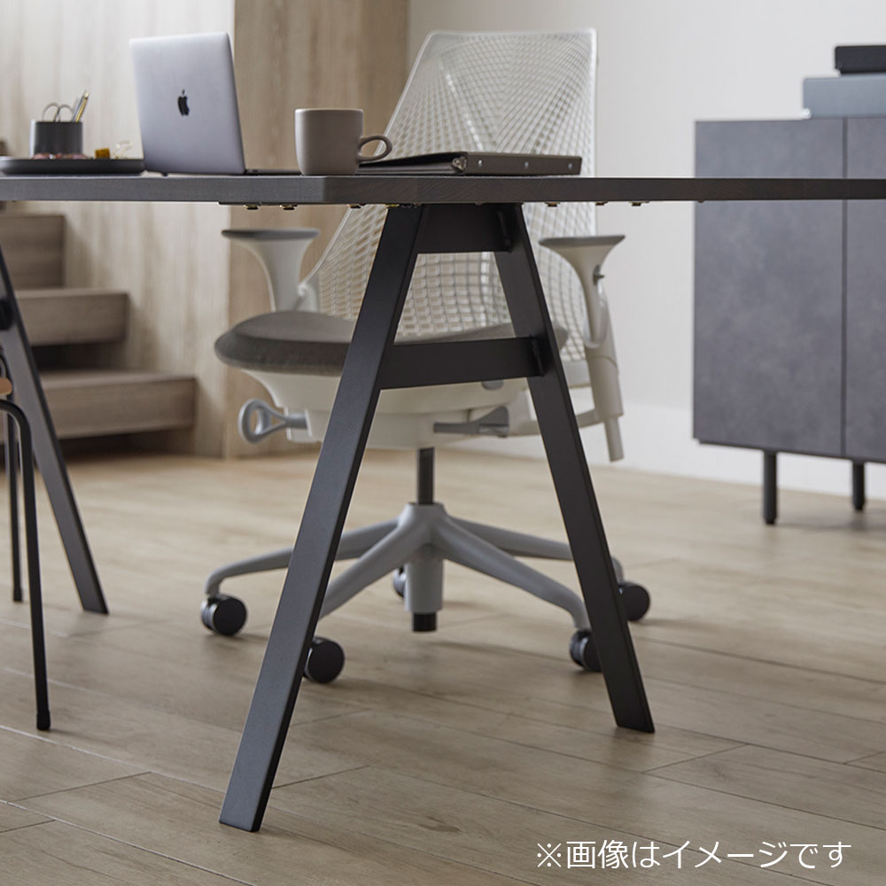 シャープなAラインデザインのスチール脚は、木製天板と組み合わせることで、人気の異素材ミックススタイルに。選ぶ天板のカラーによって印象を変えることができます。※画像は幅1800mm/天板小口スクエア(S)・オーク材グレー色(FKG)のイメージです。