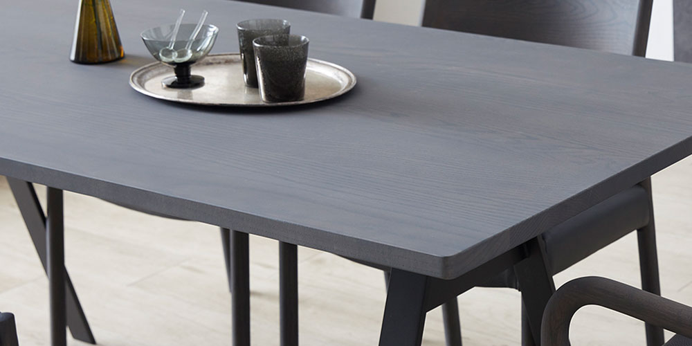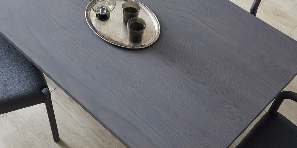 美しい木肌に木目が美しく映える無垢集成材の天板は、ダイニングシーンに天然木ならではの温もりをプラスしてくれます。丁寧に削られた天面やエッジがやさしく手に馴染み、毎日のお食事を心安らぐひとときにしてくれます。※画像は幅1800mm/天板小口スクエア(S)・オーク材グレー色(FKG)のイメージです。※天然木を使用しているため、木目や色味は一点ごとに異なります。