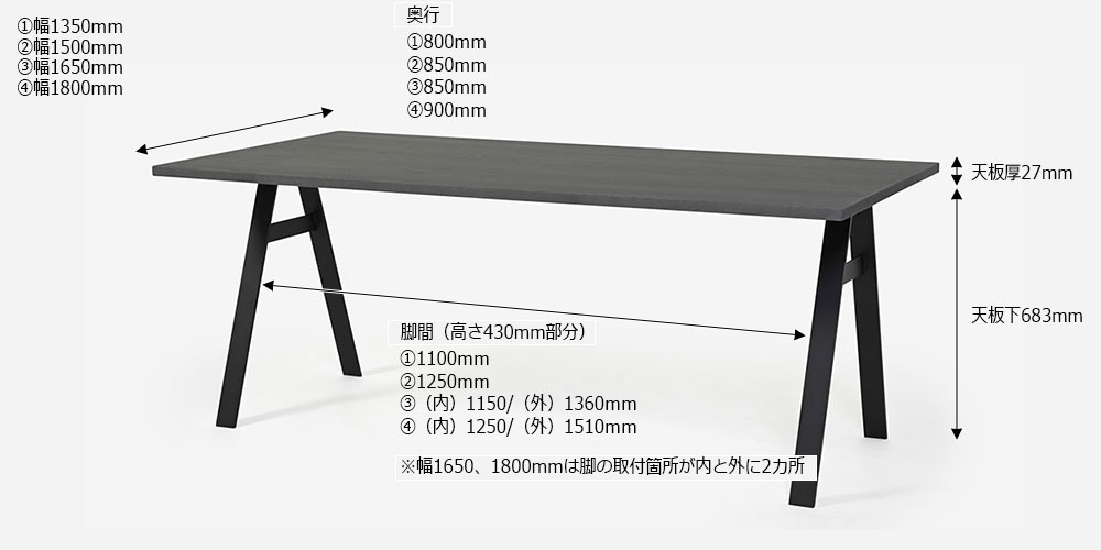 ※脚間は高さ430mm部分での数値です。幅1650、1800mmは脚の取付箇所が内と外に2カ所あります。