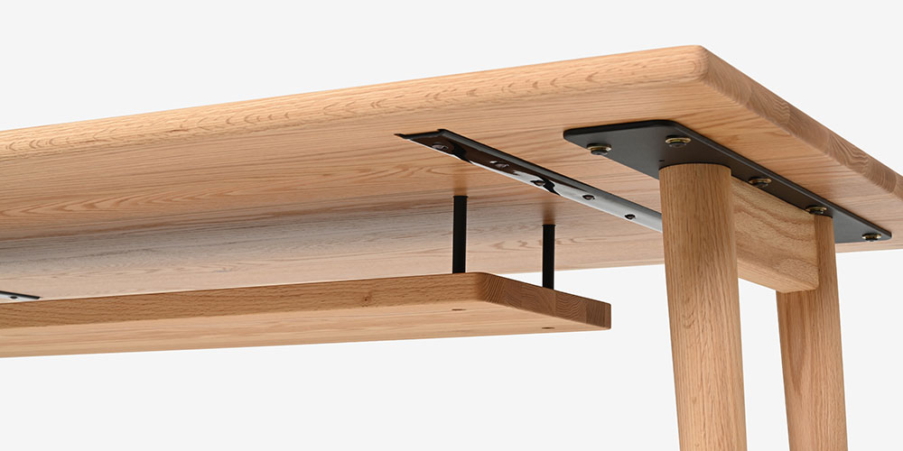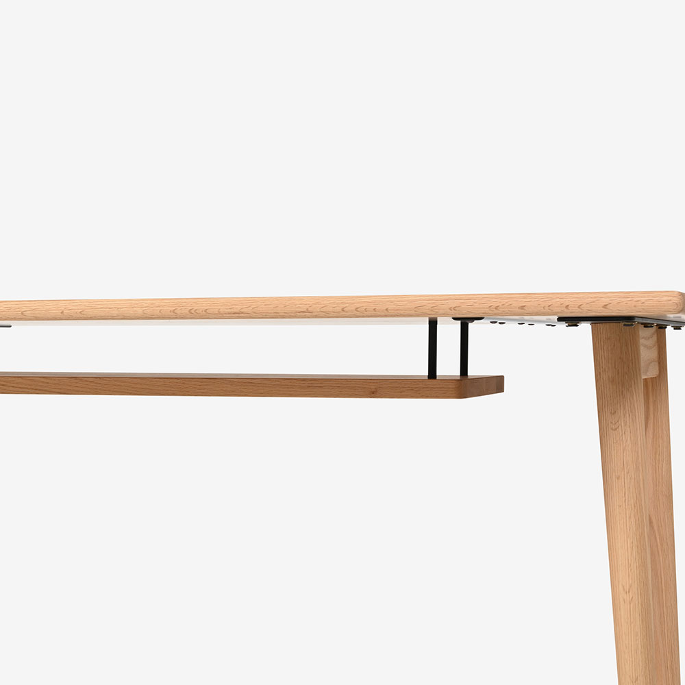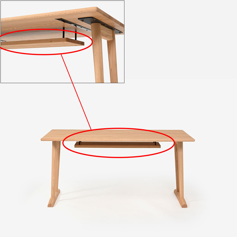 幕板がなく、余裕のあるテーブル下にはオプションで専用の棚をつけられます。リモコンやティッシュの定位置として、またノートパソコンをしまうことを想定した内寸幅78X高さ7cm。こちらは納品後でも追加でご購入いただけます。