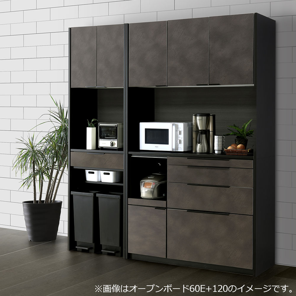 上台と下台が同じ奥行きのフラットデザインですっきりとした印象のブロンシリーズ。特徴的な柄のブロンズ色の前板に、バックボード(上台オープン部分)の落ち着いた木目柄、本体のブラックカラーとシックな配色でスタイリッシュなキッチンを演出します。オープンボード60Eはダストボックスなども収納できる下台オープンスペース付きオープンボードです。※画像はブロンシリーズのオープンボード60Eと120のイメージです。