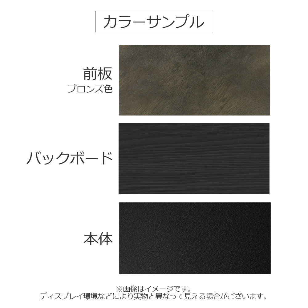 前板は刷毛で塗った跡のような柄と濃淡のある風合いがモダンな印象のブロンズ色。天板や側板、引出し内部などはマットな質感のブラックでスタイリッシュにまとめています。※ブロンズ色は凹凸のある質感の為、見る方向や光の当たり方によって見え方が異なります。また、画像はディスプレイ環境等によっても実際と異なって見える場合がございます。