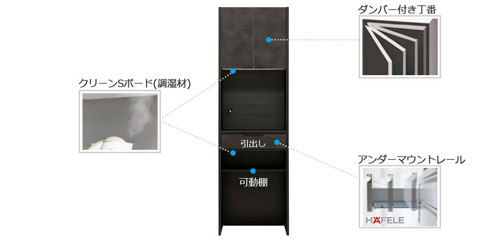 ●ダンパー付丁番:開き扉にはダンパー付丁番に使用しているため、静かな開閉が可能。