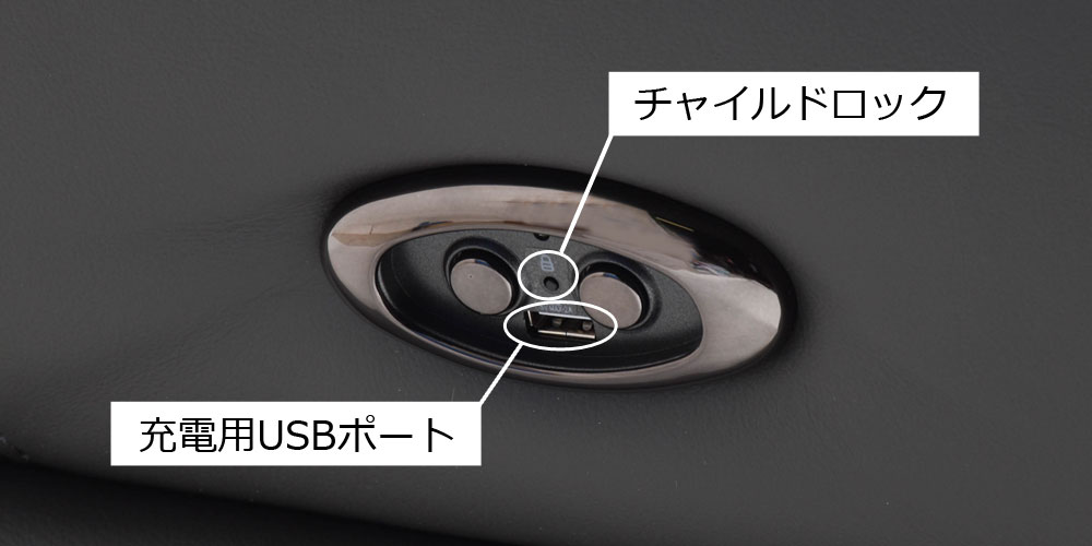 アーム側面にあるリクライニング用ボタンは押すだけでお好みの角度に調整できます。ボタン部分にはチャイルドロックやUSB充電ポートなど便利な機能つき。
