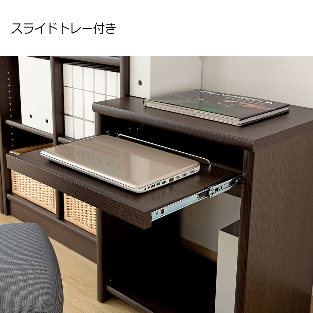 天板下にはスライドトレーが付いています。ノートパソコンやキーボードなどを置いて使えます。手前いっぱいに引き出すと簡易ロックがかかり前後のスライド動作が抑制されます。