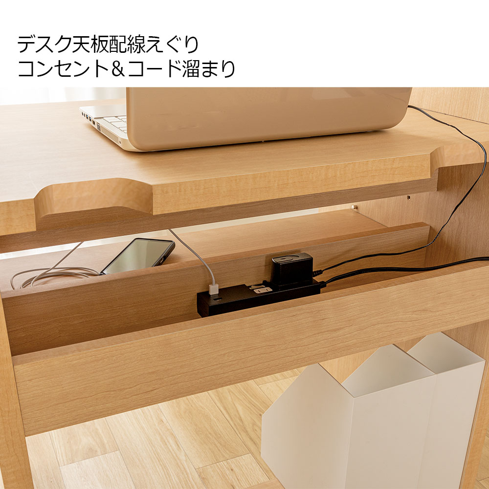 天板後部はえぐり加工されていますので、壁につけてもパソコンなどのコードを通せます。えぐりの下には配線を収めておける広めのコード溜まりを設けました。デスク付属のコンセントボックスの置き場としてもお使いいただけます。