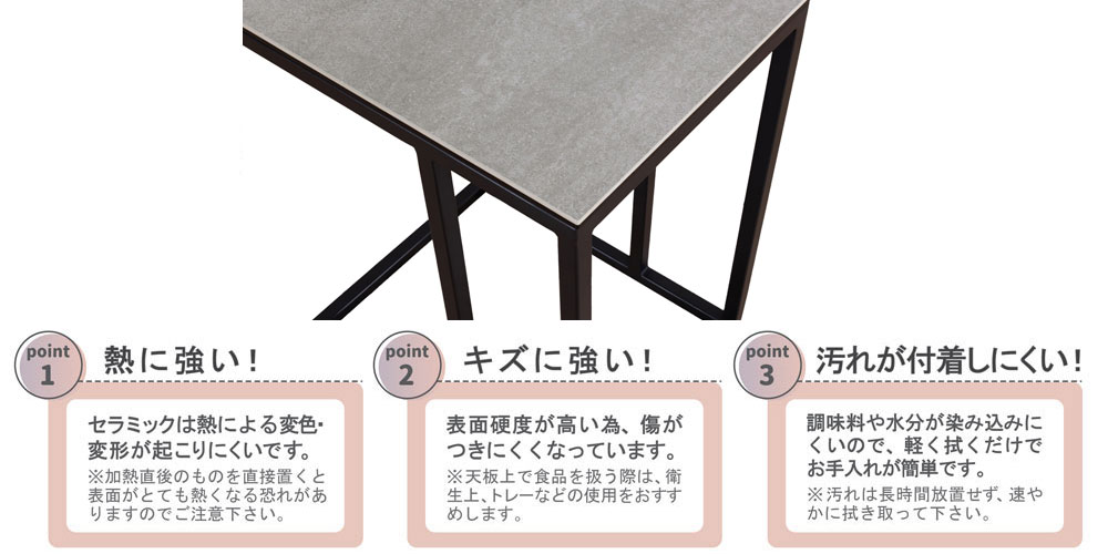 強化ガラスの上にセラミックを貼り合わせた天板を使用したサイドテーブルです。焼き物特有の素材感があり、表面の凹凸や自然の色合い、質感を楽しむことができます。