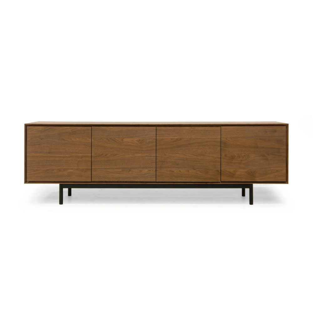 ウォールナット材の木質を活かした存在感のあるサイドボード。本体のボリュームとシンプルで細身の脚部のコントラストが空間に軽やかさを与えます。脚はウォールナット無垢材にブラックウレタン塗装を施しており、金属脚にはない趣のある質感です。