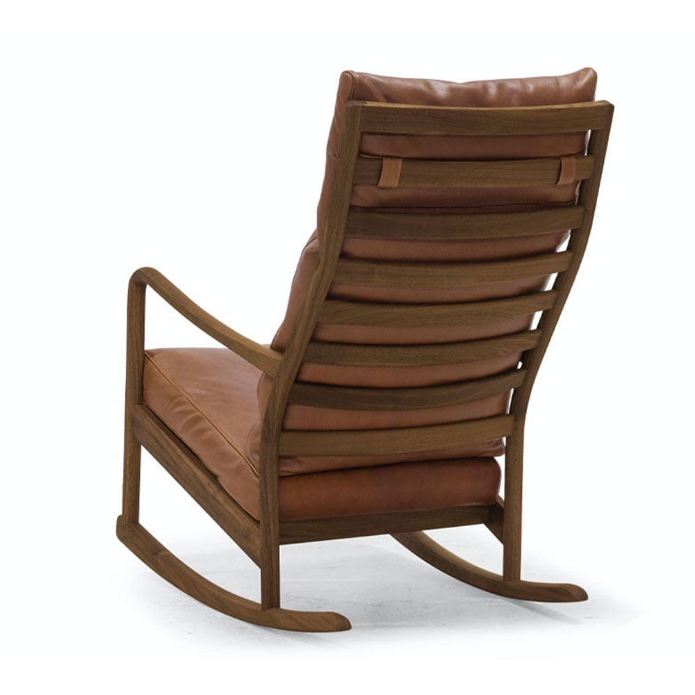 オーソドックスなスタイルをベースにしたハイバックのロッキングチェア。 アーム部分は手や腕にフィットするようになめらかな曲面を削り出しており、クッション部分はハーフダウンにすることで、しっとりした座り心地とボリューム感を実現しています。