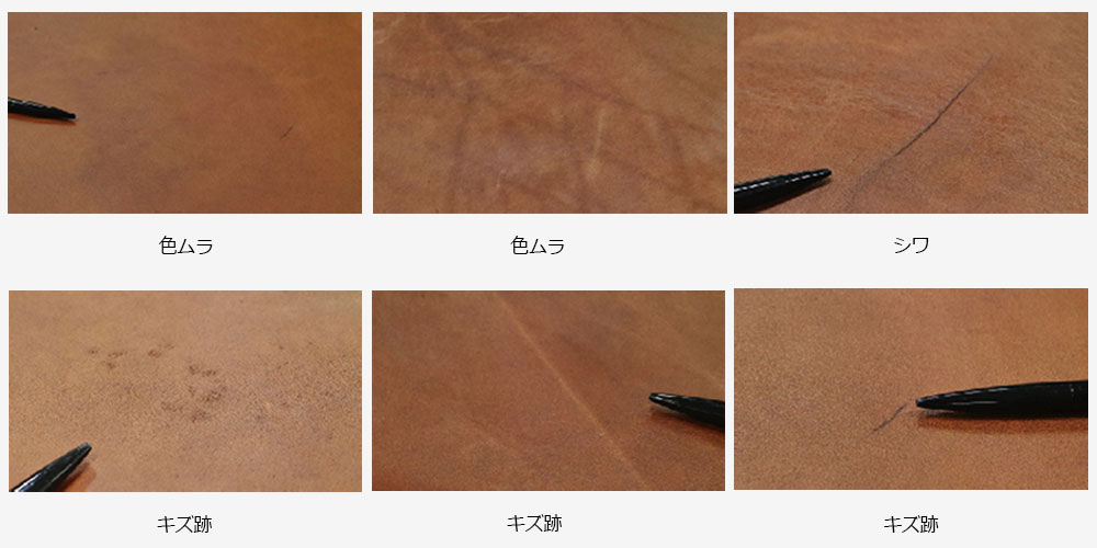 革には牛のカサブタやそばかすの跡のキズがあったり、シワの入り方が革ごとに異なります。ナチュラルマークと呼ばれるこれらの特徴は、自然の風合いとしてあえて残してあります。