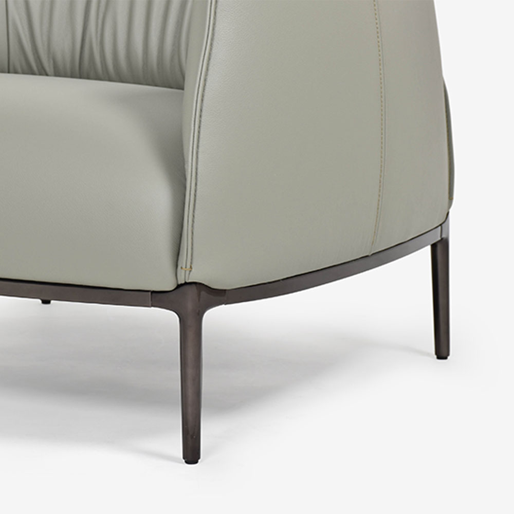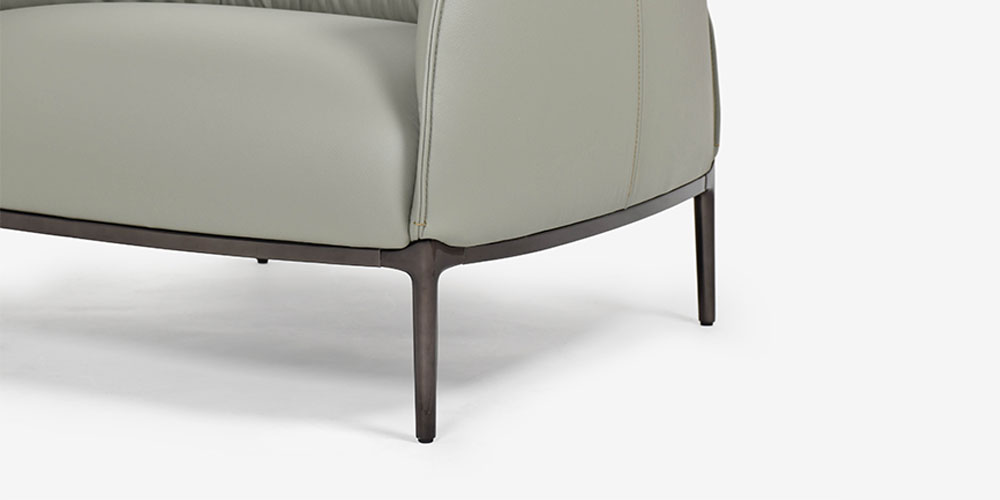 ドレープ感のあるゆったりと張られた背もたれとは対照的に、ピンと張られた座面・背面のレザーのコントラストが美しく、高い張込み技術がうかがえます。 張地の縁を際立たせるような丁寧なステッチが洗練された雰囲気を演出しています。